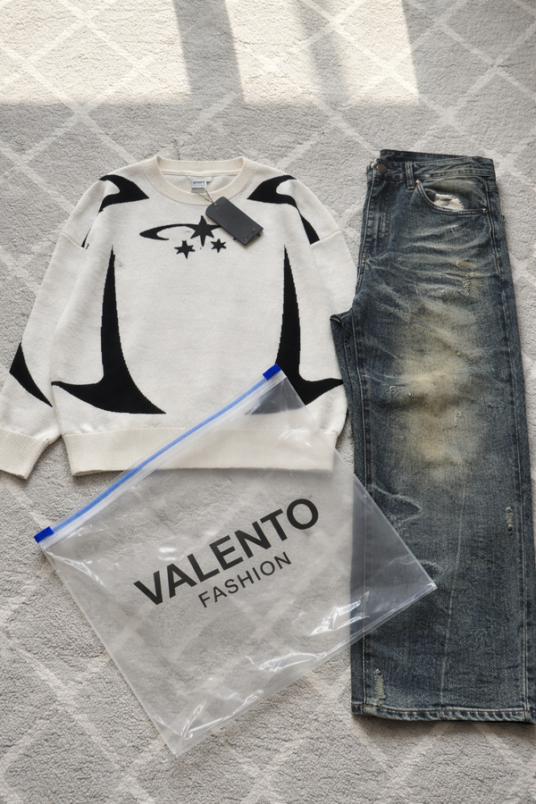 This is a knitted sweater designed for everyday wear. It is made from a cotton blend knit that provides warmth and a soft feel. The sweater offers an easy layer for cooler days, with a relaxed silhouette and ribbed edges for a neat finish.